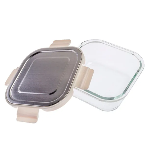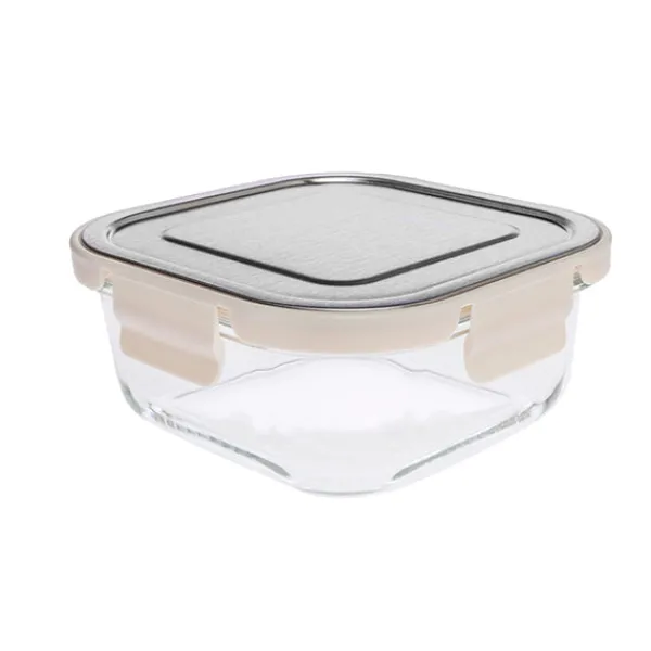 El envase para alimentos con cierre hermético tiene dimensiones de 15,5×15,5×6,8 cm y una capacidad de 800 ml. La tapa está fabricada en cristal de borosilicato en un tono crudo, mientras que el 10% restante está compuesto por acero inoxidable y polipropileno (PP). Este envase ofrece un diseño hermético para preservar la frescura de los alimentos. Con materiales duraderos como el cristal de borosilicato y el acero inoxidable, es una opción segura y funcional para almacenar alimentos en la cocina.