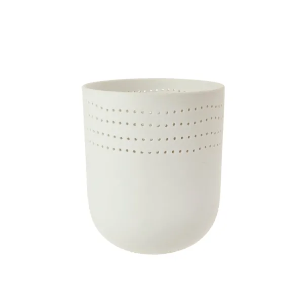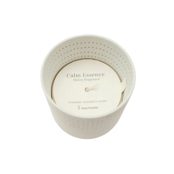 Luz cálida y aroma dulce Vela aromática con fragancia de miel, en recipiente de cerámica troquelado que deja pasar la luz. Hecha con un 55% de cera vegetal. Duración: 25-30 horas.